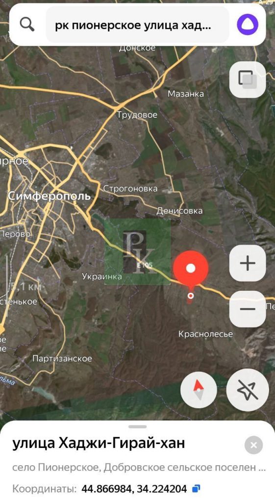 Расположен в селе Пионерское, на улица Хаджи-Гирай-хан. Участок ровный, угловой, прямоугольной формы. Подъезд подсыпан щебнем.